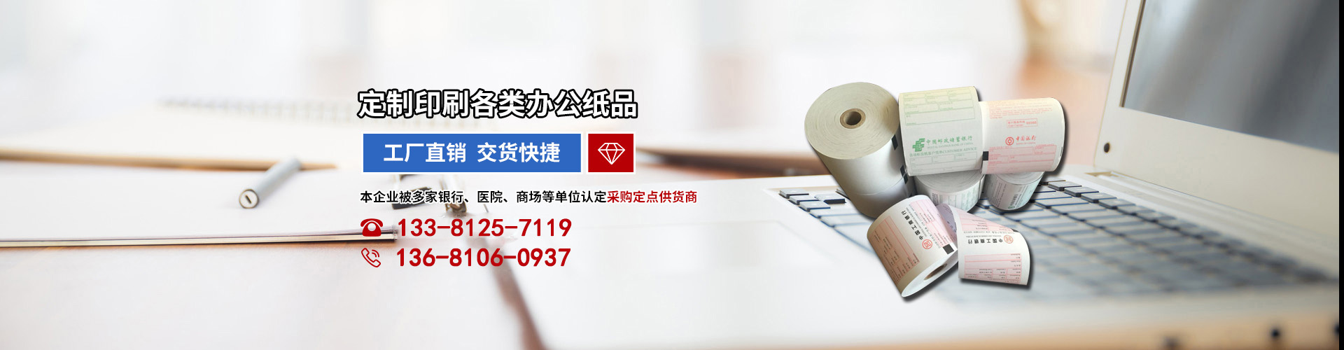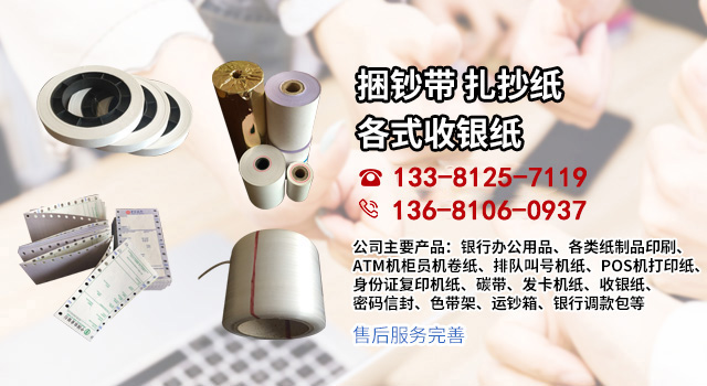 公司主要產(chǎn)品:銀行辦公用品、熱敏紙、ATM機(jī)柜員機(jī)卷紙、排隊(duì)叫號(hào)機(jī)紙、POS機(jī)打印紙、身份證復(fù)印機(jī)紙、碳帶、發(fā)卡機(jī)紙、收銀紙、密碼信封、色帶架、運(yùn)鈔箱、銀行調(diào)款包等。